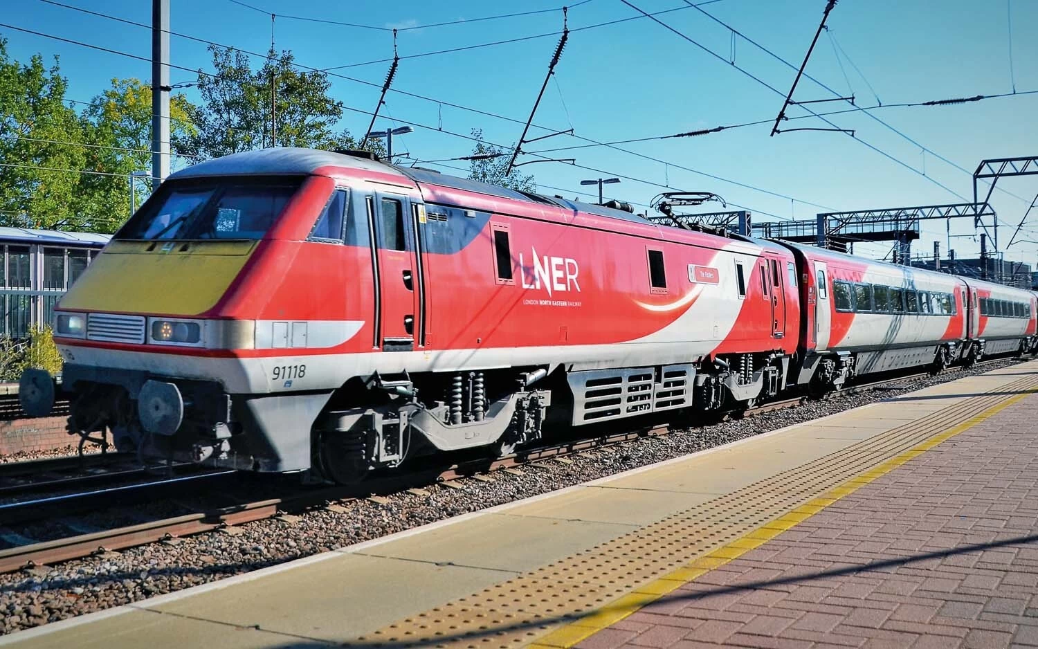 91118 entered traffic in August 1990 carrying the number 91018 and in November 1993 was named ‘Robert Louis Stevenson’, which it carried until May 1997. Between February 2000 and February 2009, the locomotive carried the name ‘Bradford Film Festival’, receiving the Project Delta Class 91/1 upgrade in November 2002. On 27 March 2018, the locomotive was named ‘The Fusiliers’ at a ceremony commemorating the 50th anniversary of the Regiment, representatives from the First and Fifth Fusiliers providing the Guard of Honour, along with Colonel of the Regiment, General Paul Nanson, who officially named 91118.