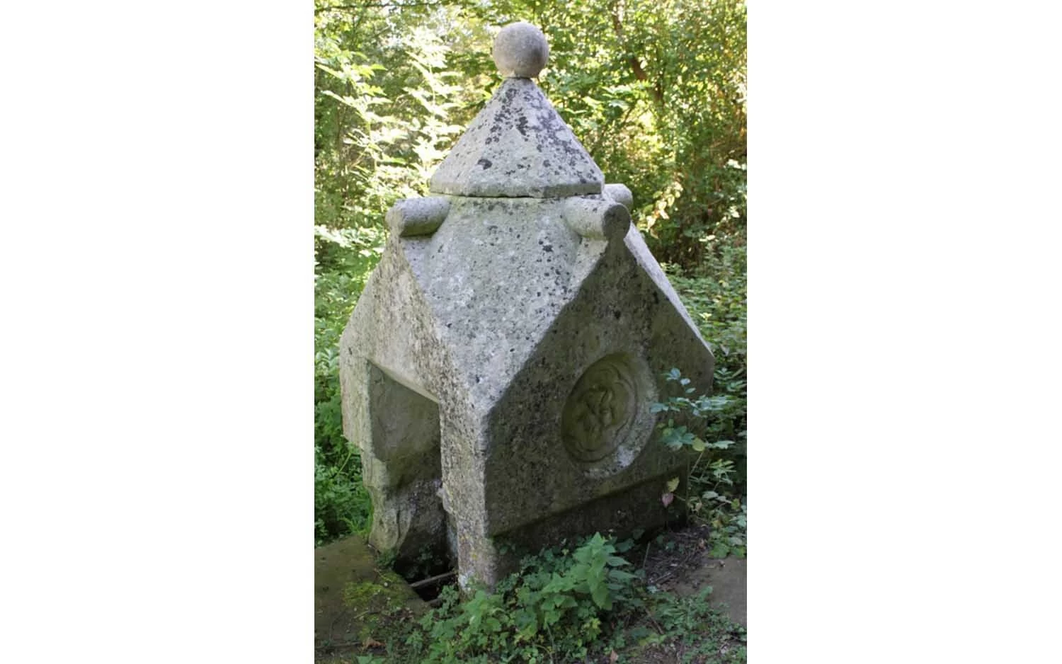 Model of a village water pump in a stone structure.