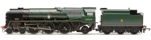 This is a Hornby R3566 OO Scale BR 4-6-2 ‘Nederland Line’ 35014 Merchant Navy Class (Re-built) Early BR. Conceived in 1937 when Oliver Bulleid became Chief Mechanical Engineer of the Southern Railway, the Merchant Navy Class represented Bulleid’s vision for a quick accelerating, mixed traffic 4-6-2 locomotive, equally capable of hauling passenger services (such as the Golden Arrow and Atlantic Coast Expresses), or freight workings, to a speed of around 75mph. In 1934, Bulleid had been opposed the use of streamlining, but for the Merchant Navy’s ‘air-smoothed’ design it suited his purposes, being easy to clean mechanically and hiding the boiler’s external pipes, which in turn meant they could be run for function, rather than aesthetics.