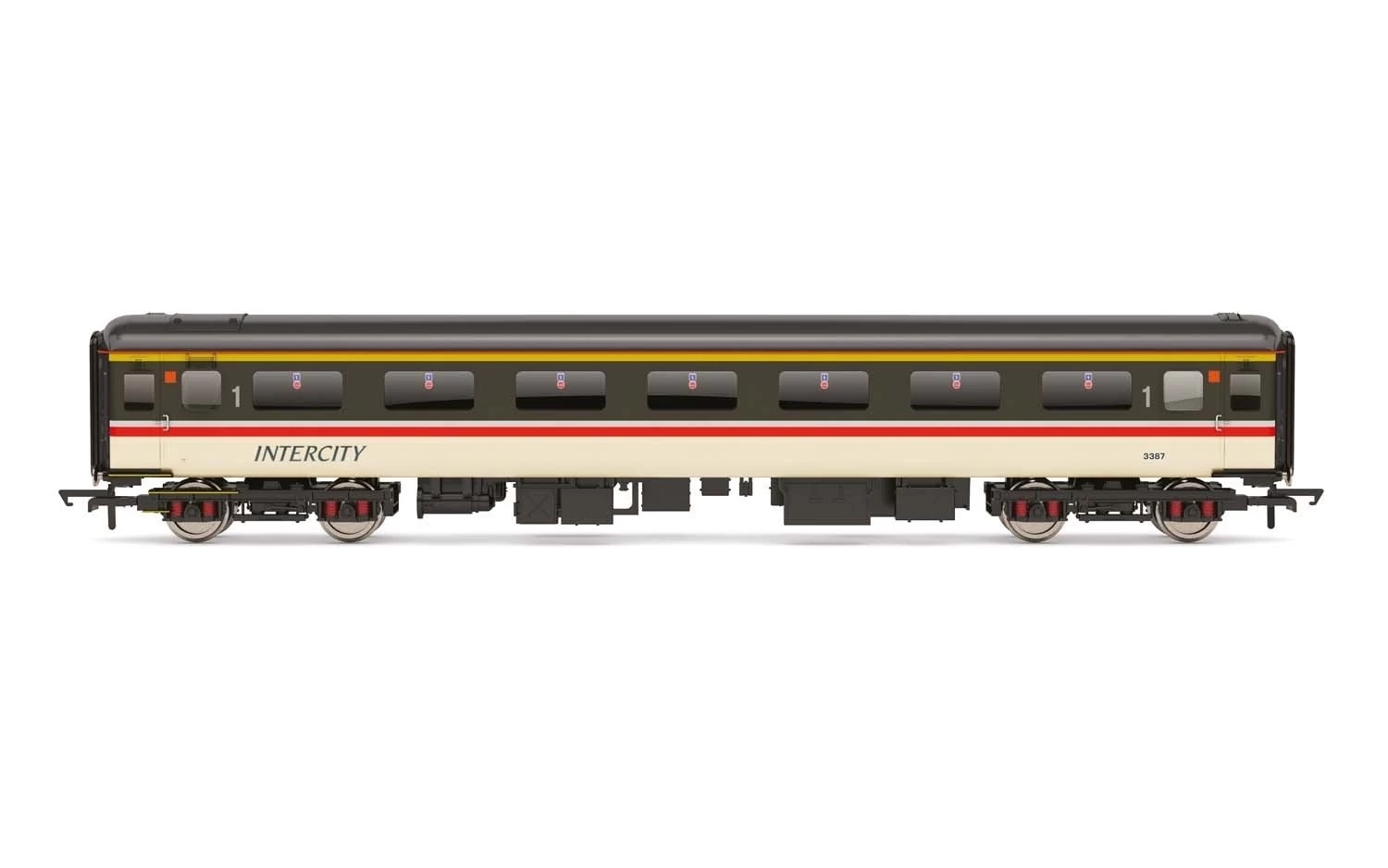 This is a Hornby R4920 OO British Railways Intercity Mk.IIF First Open Coach Car – Era 8 #3387. Specifications: Length: 268mm; Period: Era 8 (1982 – 1997); Operator/Livery: BR Intercity, Executive; Designer: BREL.