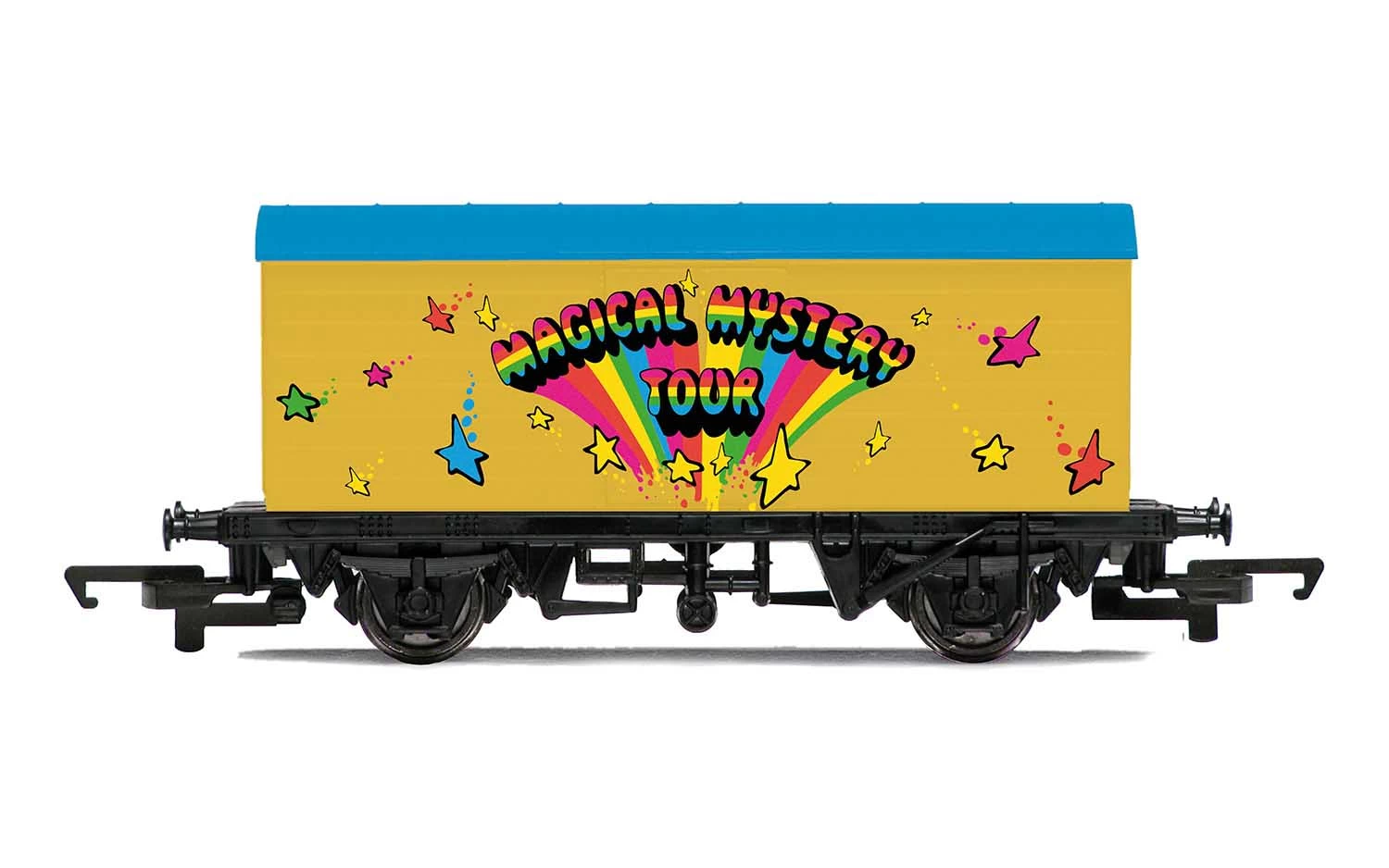 This is a Hornby R60011 OO The Beatles Magical Mystery Tour Wagon. ‘Yellow Submarine’ was the tenth studio album by The Beatles, released in January 1969. The album served as the soundtrack to the animated film of the same name and as such featured Beatles songs on one side and the orchestral film score on the other. Much loved songs form the album include ‘Yellow Submarine’, ‘Hey Bulldog’ and ‘All You Need is Love’ among others. The album is celebrated by Hornby on this goods van featuring specially designed artwork inspired by the album.