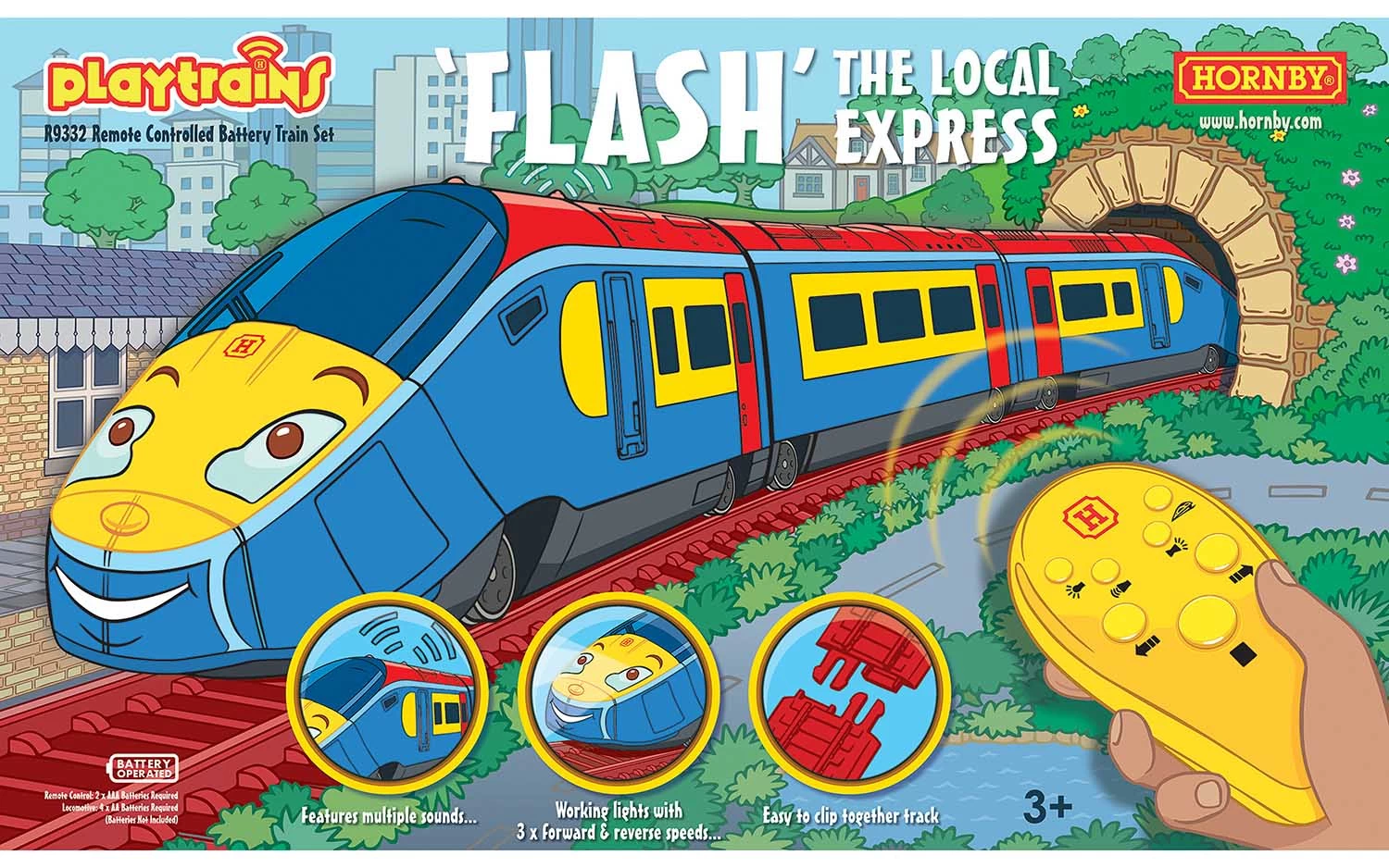 This is a Hornby R9332 Flash The Local Express OO Gauge RC Battery-Powered Train Set. The train features working lights, multiple sounds and 3x speeds in forward and reverse. With additional products available such as solo locomotives, rolling stock and track packs there are endless opportunities to expand and build a Playtrains world. The set Includes: Flash the train, An oval of track, A TrakMat, Remote control, A cardboard station and tunnel.